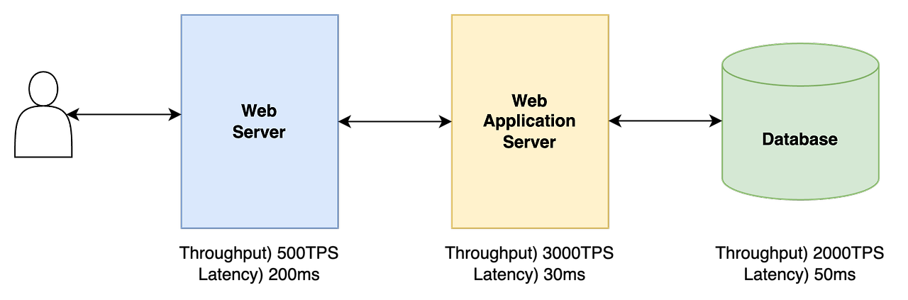 따라서 위의 예시에서 병목 지점은 Web Server가 되며 Throughput 관점에서의 성능 개선은 병목 지점을 지속적으로 개선하며 전체 서비스의 성능을 올리는 것입니다.